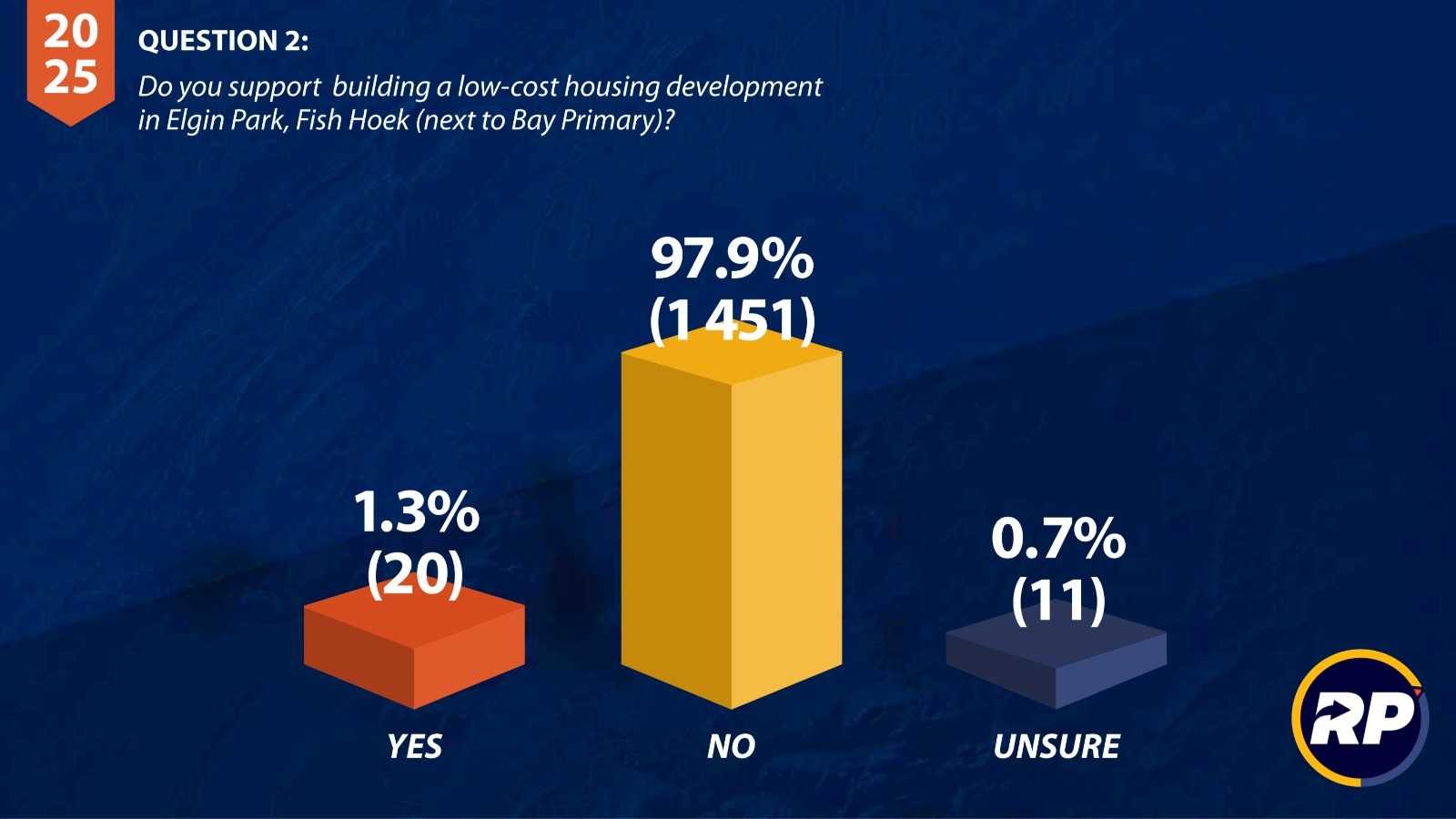 The poll addressed the City’s controversial plan to move residents from Masiphumelele into Fish Hoek, Ocean View, and the Lochiel Road smallholdings, as well as the proposed low-cost housing development in Elgin Park, adjacent to Bay Primary School.